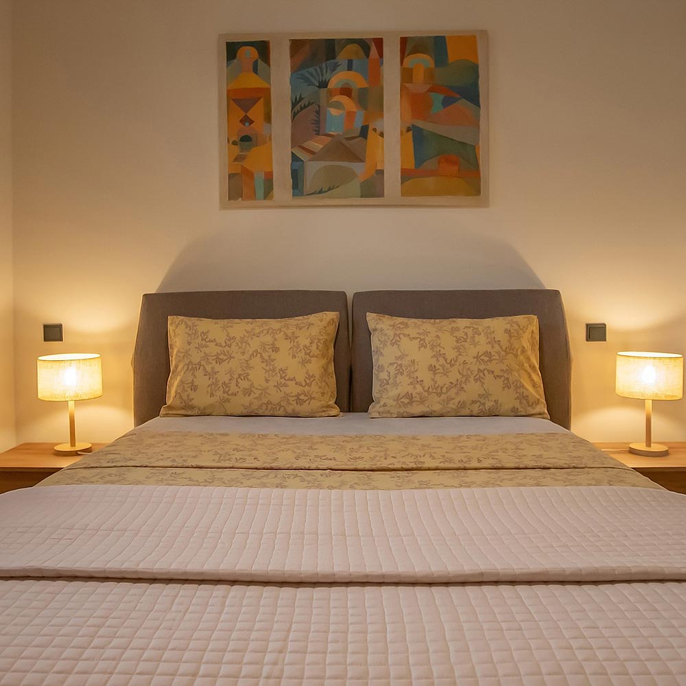 Με επιφάνεια 54 τ.μ., φιλοξενεί ζευγάρια ή μικρές οικογένειες, διαθέτοντας ένα διπλό κρεβάτι και έναν καναπέ στο σαλόνι. Το ευρύχωρο μπάνιο περιλαμβάνει ντους, στεγνωτήρα μαλλιών, πετσέτες, παντόφλες και λευκά είδη για τη δική σας άνεση.
