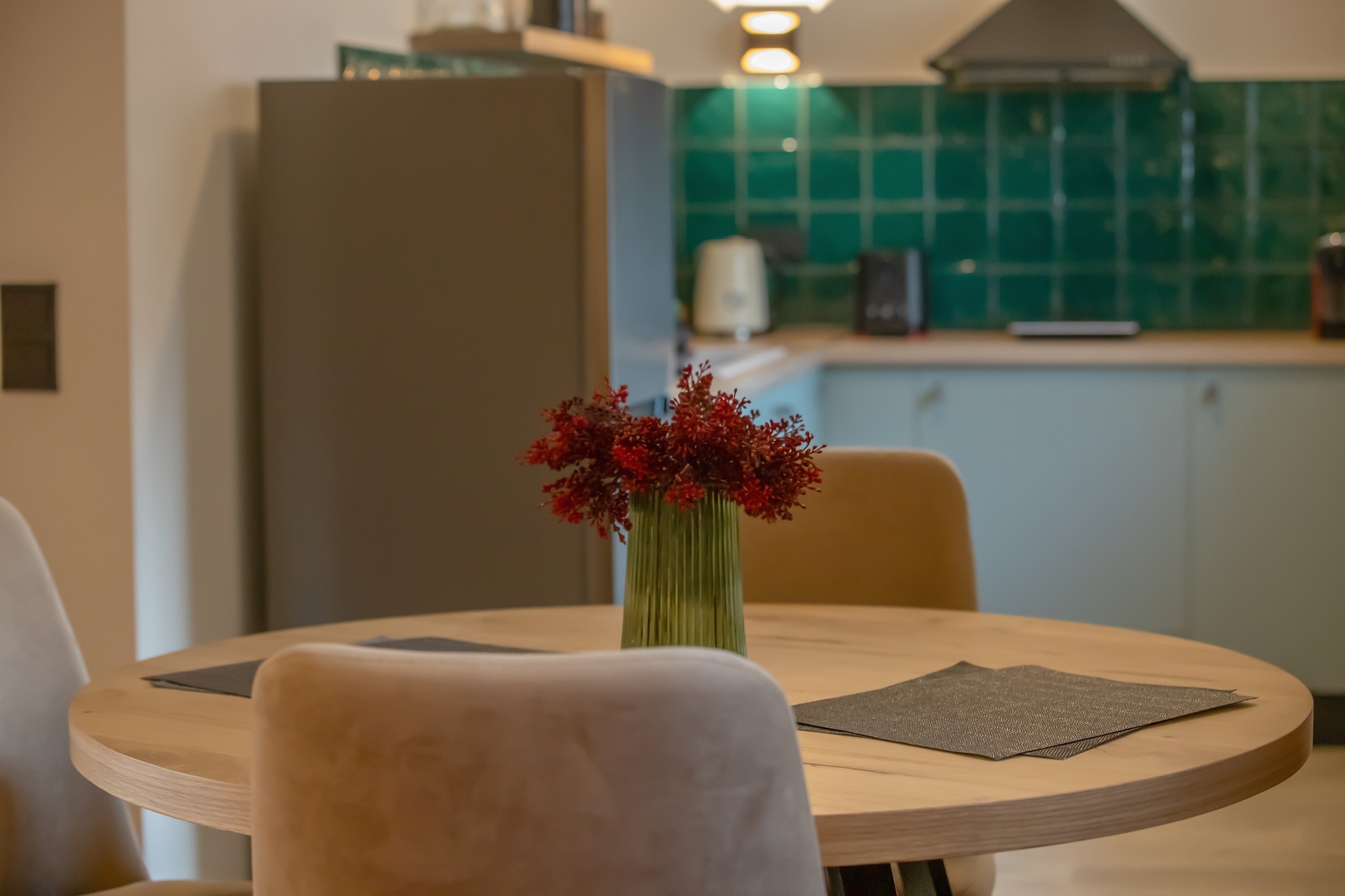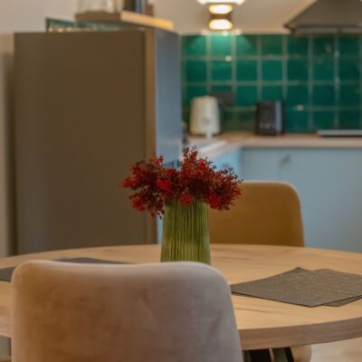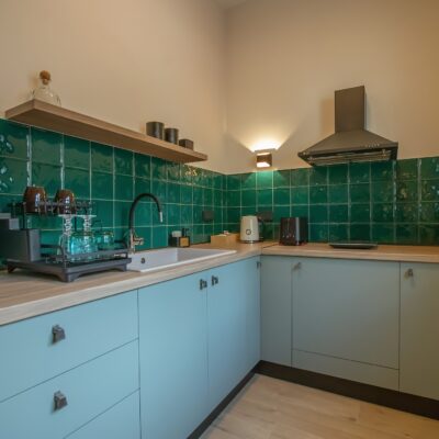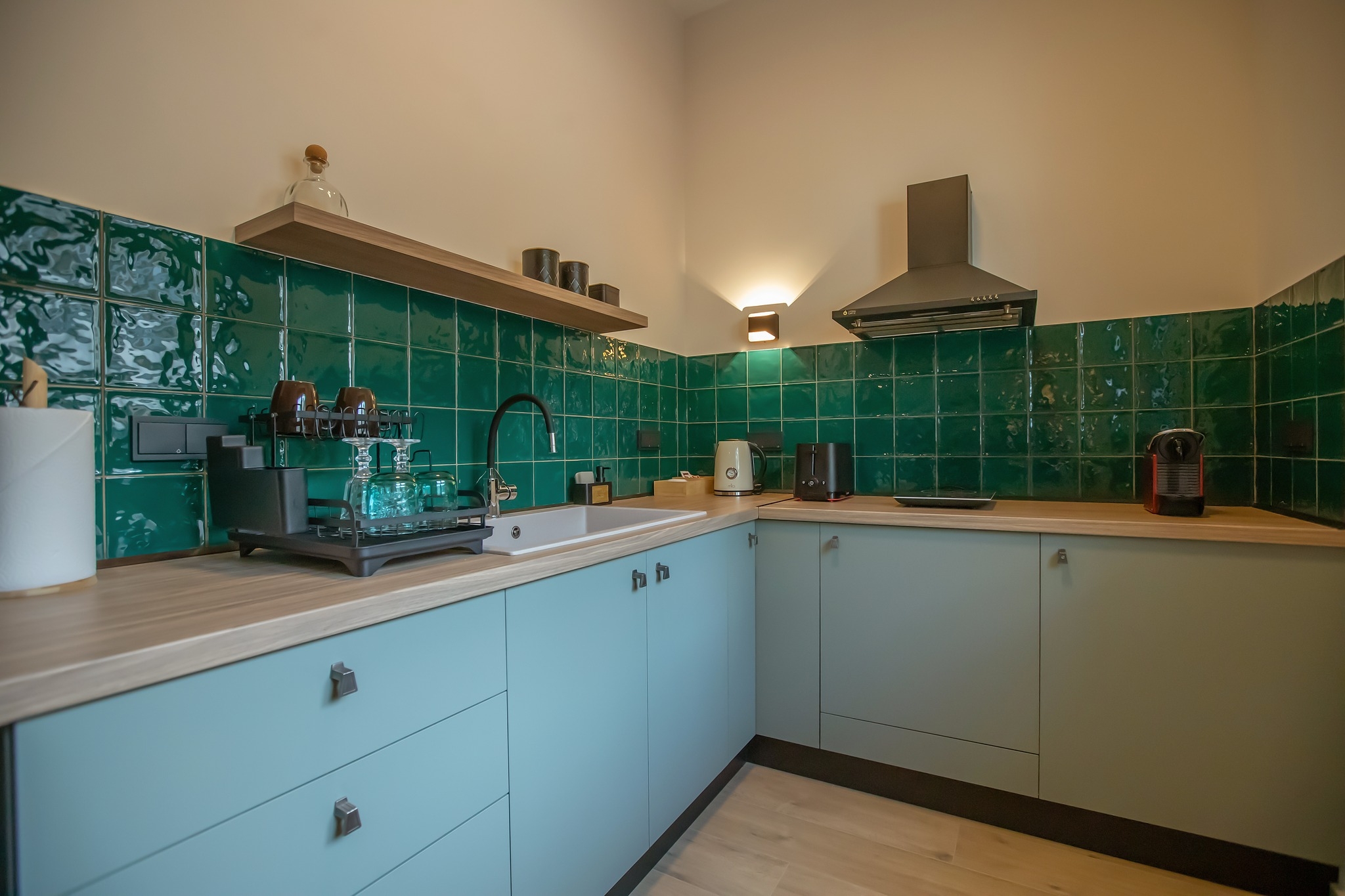 Οι επισκέπτες μπορούν να απολαύσουν μια πρακτική και μοντέρνα κουζίνα, καθώς και άμεση πρόσβαση στον κήπο – ιδανικός για έναν χαλαρωτικό καφέ.